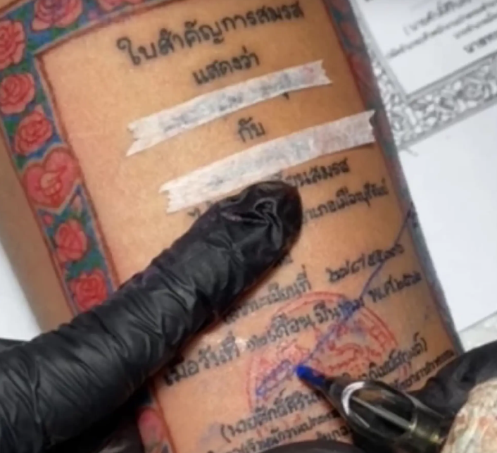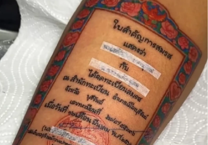 Seorang pria berusia 37 tahun dari provinsi Buri Ram Thailand menjadi viral setelah foto surat nikahnya yang ditato di lengan kiri atasnya menjadi ramai di Facebook.