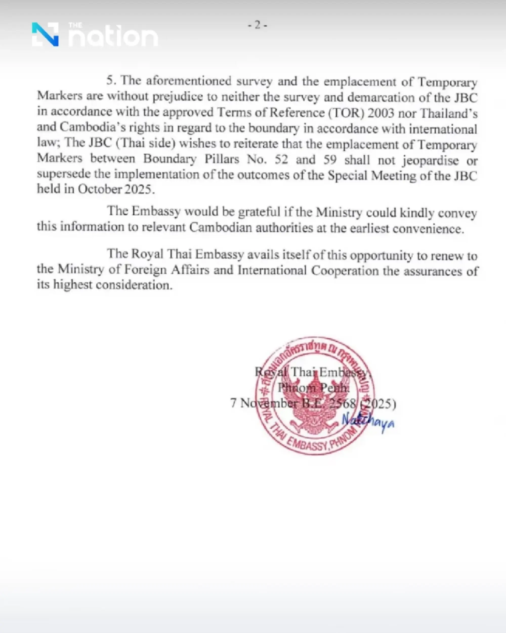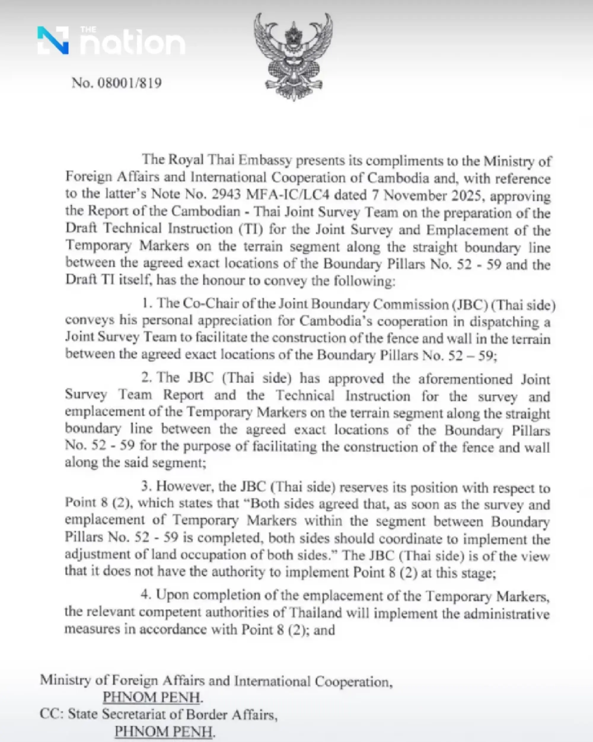 Kedua kementerian luar negeri kini telah menyelesaikan penandatanganan dan persetujuan Instruksi Teknis (TI) untuk survei dan pemasangan patok batas sementara di antara pos batas No. 52–59, yang menandai selesainya Tahap 1 dan 2 dari proses tersebut.